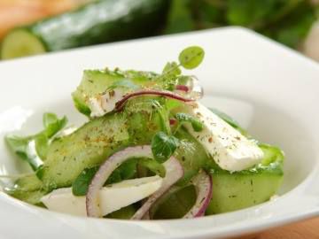 3 db uborka friss 1 db lila hagyma 4 szelet feta sajt szeletelve 1 csipet oregánó friss, esetleg szárított 1 csipet cukor 3 evőkanál olívaolaj 1 csomag Knorr Kapros Salátaöntet por